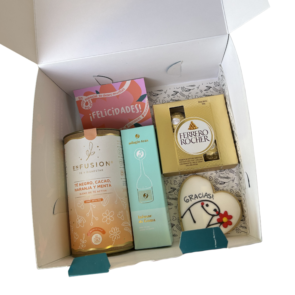 Incluye: Infusión variedades Botánica Gourmet, Ferrero Rocher 4 und, galleta temática, Filtro de papel Adagio y una tarjeta para ese mensaje especial.