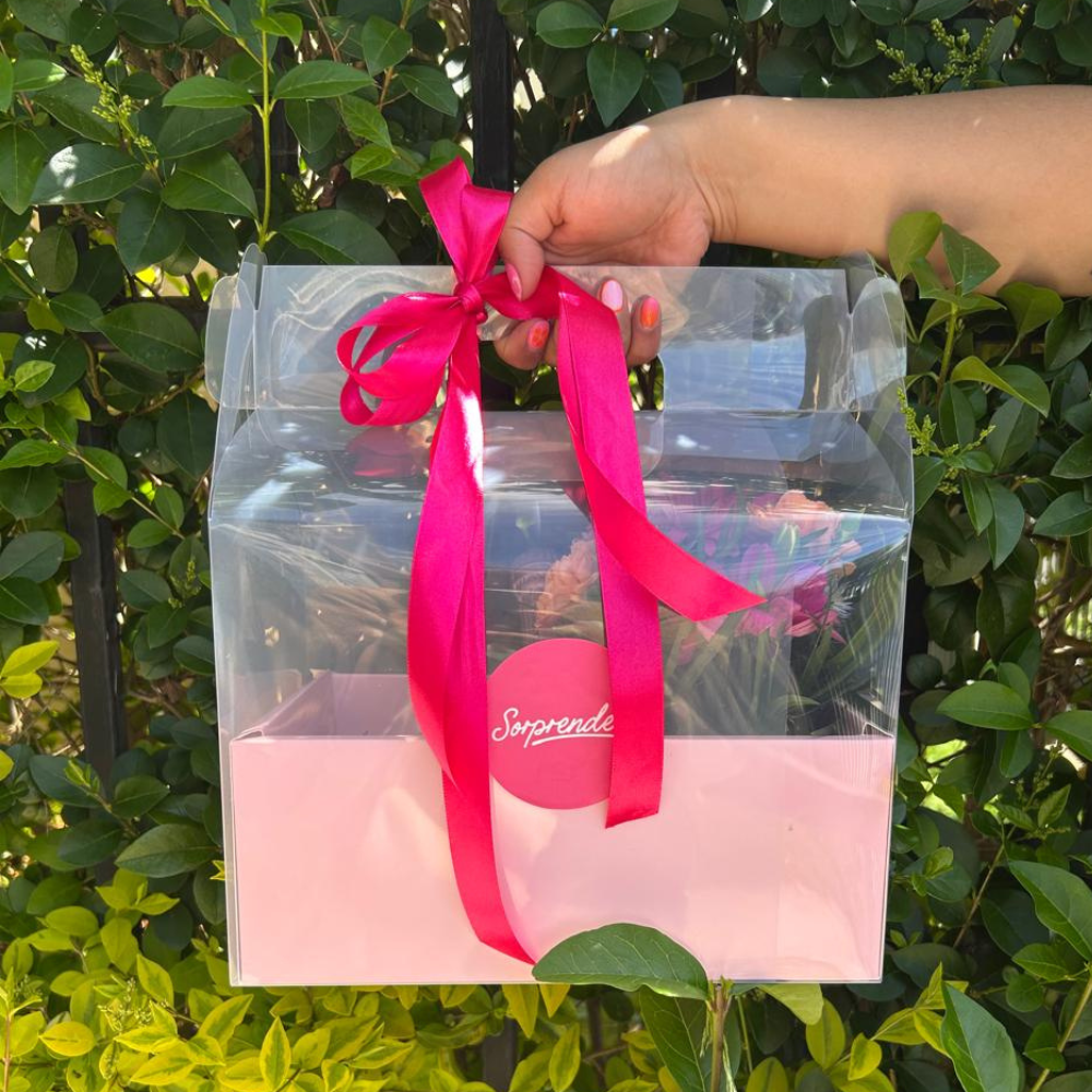 El Maletín Pensando en Ti – Dulce es una experiencia pensada para sorprender y emocionar, combinando flores frescas, una deliciosa Mini Torta, galleta glaseada temática y un jugo, todo presentado en un elegante maletín transparente con detalles especiales de San Valentín.